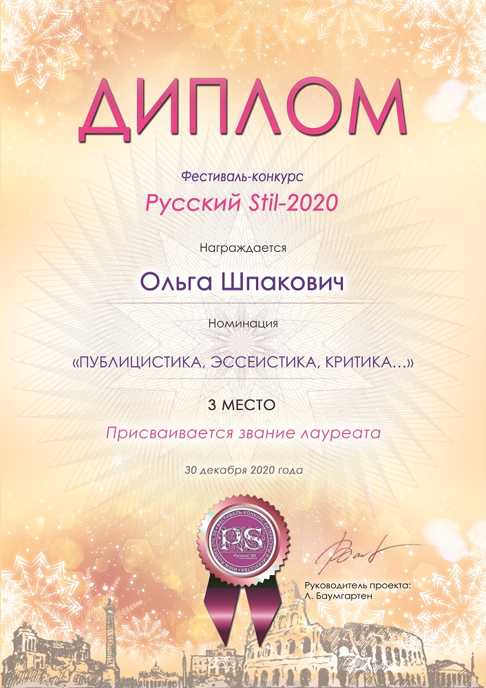 Кругом только и слышно - трудный год! А для меня он - намного легче, чем 2019-й, ну, пандемия... Но, по крайней мере, ничего у меня больше не сгорело и не сломалось. О 2020-м нельзя говорить без 2019-го, потому что то, что было заложено тогда, получило развитие сейчас. Так, в 2019 году разорился мой бизнес, в который я вложила все, что у меня было, все, накопленное непосильным трудом офисного рабства. И я понимаю, почему: я - не продавец, поменять сидение в одном магазине - на сидение в другом, пусть и собственном - не мой путь. Я - творческий человек, у меня - другие энергии. Что ж, приобрела опыт, а опыт стоит денег. Зато теперь мой бизнес ушел в виртуальное пространство, у меня интернет-магазин "S-Gallery". Дальше. Не успела я оправиться от разорения, как судьба решила меня добить - полностью сгорела моя квартира. И я осталась без всего - без денег, без вещей, да еще и без крыши над головой. Бомж! Честно? Подумывала о суициде. Но - справилась! Люди - знакомые и незнакомые - собирали для меня вещи, все - от зубных щеток, тарелок и прочих предметов первой необходимости, - до денег. Благодаря помощи людей, особенно собратьев по перу моего родного Союза писателей Санкт-Петербурга, я восстановила квартиру из пепелища. И еще: после того, как я выжила благодаря помощи людей, я поняла, как это важно, когда в беде ты не один! И с тех пор благотворительность - мой образ жизни. Я и мои единомышленники создали Фонд "Мир" - это произошло в 2020 году. А теперь - о творческих проектах. В январе 2020 года состоялась премьера спектакля "Точка невозврата", по мотивам повести Саши Кругосветова "Сжечь мосты", по моему сценарию. Одноактный спектакль был показан в Доме Шрёдера и на Малой сцене театра им. Н.Ф. Комиссаржевской. Сейчас, несмотря на пандемию, мы продолжаем работу над этим проектом. Я написала 2-й акт, поднимающий действо с уровня бытовых сцен - до уровня метафизики и философии. 2-й акт написан по мотивам уже нескольких произведений Саши Кругосветова. Теперь название спектакля - "Мосты в прошлое", Премьера переносится на 2021 год. Сменился творческий состав нашего проекта, но он продолжает жить. Теперь художественный руководитель нашего театра антрепризы - Леонид Алимов, художественный руководитель театра им. Н.Ф. Комиссаржевской. Под его руководством мы готовим еще один спектакль по мотивам повести Саши Кругосветова - "Фуагра", его премьера также состоится в 2021 году. Коллеги доверили мне оценку произведений, присланных на конкурс им. Н.В Гоголя (номинация «Шинель») и конкурс «Созидающий мир» — я была членом жюри этих значимых литературных конкурсов. В течение лета и осени я отредактировала три романа, которые вышли в издательстве Союза писателей Санкт-Петербурга. И под новый год я начала сотрудничество еще с одним крупным издательством - занимаюсь художественным переводом с английского языка романа, который выйдет под рубрикой "Впервые на русском". Публикация моего рассказа "Подруга" состоялась в сборнике "317"., который увидел свет в декабре 2020 года. Сюрприз под конец года — по итогам Фестиваля-конкурса «Русский Stil-2020», цель которого — представление современной русской литературы международной литературной общественности» — в номинации «Проза» звание — «Автор — стильное перо» за рассказ «Где-то в эпоху короанвируса», и звание лауреата и 3 место в номинации «Публицистика, эссеистика, критика» за 